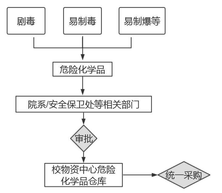 1. 剧毒、易制毒、易制爆等危险化学品需通过院系、安全保卫处等相关部门审批,由校物资中心危险化学品仓库统一采购。